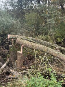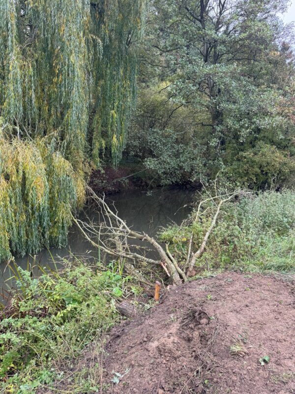 Additional works included hinging and felling selected willow limbs across the channel, then securing them to the bank. These natural “bridges” interact with the river during higher flows, helping to slow water and spread it onto the floodplain.